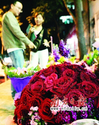 記者在該花店看到,19支紅玫瑰、一支黃天霸百合,再加一些桔;āM天星陪襯,價(jià)格就是280元。而元宵節(jié),也就是“中國情人節(jié)”時(shí),這一“套餐”的價(jià)格只是180元!皟r(jià)格確實(shí)比前兩天上漲了不少!痹摰甑陠T說,一支普通的國產(chǎn)玫瑰,平常的價(jià)格是2—3元,元宵節(jié)期間要5—6元,到情人節(jié),就變成了10—15元!耙环矫媸且?yàn)檫M(jìn)貨貴,另一方面是因?yàn)槲鞣角槿斯?jié)對(duì)情侶們更具有吸引力,鮮花的銷量比平常要好很多,我們不怕有價(jià)無市!被ǖ昀习迥镎f,昨天該花店就接受了一名顧客預(yù)定的99朵玫瑰花束,價(jià)格1200元。
