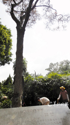 這株名木被稱為“廣州市區(qū)內(nèi)年齡最大的馬尾松 ”,已有106歲。主干胸徑已長到200厘米,需要兩個人才能環(huán)抱住。有人會覺得奇怪,手植松距今才98年,怎么會多了8年?公園管理人員解釋,1912 年,孫中山先生親臨黃花崗植樹時,樹苗已8歲。當(dāng)年,孫中山先生一共種了四棵馬尾松樹,目前僅這一棵幸存!昂喼本褪恰笮茇垺@棵馬尾松有特殊的紀(jì)念意義”。