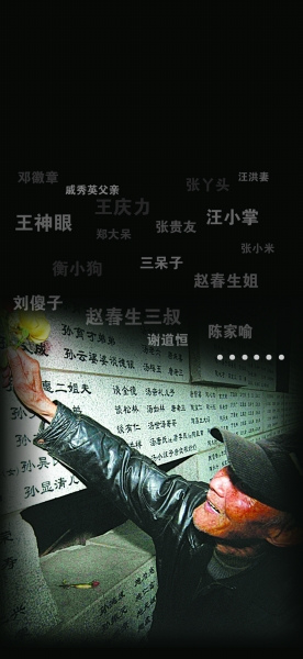 記者拿到部分即將刻上“哭墻”的姓名,發(fā)現(xiàn)有的遇難者無姓也無名,比如三呆子、二道標(biāo)等;有的有姓但無名,比如劉傻子、王老二、許小四等;還有的只是某某人親戚,比如趙春生三叔、趙春生姐、戚秀英父親、龐世昌哥哥等。