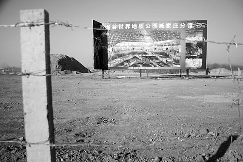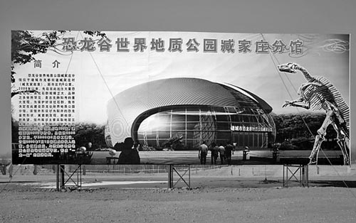 在諸城市政府網(wǎng)站上,關(guān)于最新的招商引資項目中,就有兩個關(guān)于建設(shè)恐龍化石地質(zhì)公園的項目。在臧家莊發(fā)掘現(xiàn)場,一個蛋殼形狀的場館規(guī)劃圖屹立在發(fā)掘現(xiàn)場。工作人員介紹說,自2008年以來,先后在此出土大量恐龍化石,該化石群規(guī)模之大、品種之多世界罕見,是古生物科考的重大發(fā)現(xiàn)。為保護好該化石群,諸城市決定在此建設(shè)恐龍谷世界地質(zhì)公園分館。該館外形設(shè)計為裂開的恐龍蛋殼形狀,寓意新發(fā)現(xiàn)、新收獲、新希望。館內(nèi)展示主要采取底層立體展示、化石平面展覽、 地下化石層隧道展示等,項目占地約100畝,建筑面積3500平方米,總投資2000多萬元,于2008年9月開工建設(shè),計劃2009年7月1日前建設(shè)并投入運營。分館建成后,與恐龍谷世界地質(zhì)公園主場館遙相呼應(yīng),形成“一龍一蛋” 的旅游格局!敖ǔ芍蟠蠹揖涂梢皂樦鎏莸降叵,看看發(fā)掘現(xiàn)場,看看恐龍化石,這些在不遠的將來都會實現(xiàn)!惫ぷ魅藛T告訴記者。工作人員所說的主場館,就是即將建立在這次發(fā)掘出最大鴨嘴龍化石的庫溝村村北。在這條東西走向的化石隆起帶上,將建成一座全新的恐龍化石地質(zhì)公園。“ 這里發(fā)掘的恐龍化石,顏色還真挺特別,紅色、褐色的特別多,可能與這里的土質(zhì)有關(guān)吧!周圍都是紅土。 而在臧家莊那邊,發(fā)掘的化石顏色大都是黑色或者白色!