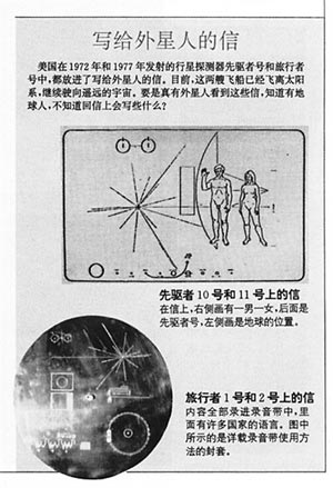 這種名片被認為是一種與外星人進行直接溝通的方法。在名片上,人類以圖畫的形式表示出了太陽系、地球所在的位置、男人和女人的形象。人們希望當探測器在飛出太陽系后萬一被什么外星智慧拾獲,會發(fā)現(xiàn)我們的存在。