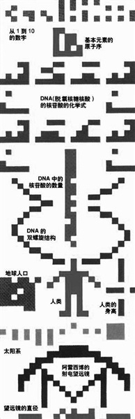 1974年11月16日下午,位于波多黎各的大型射電望遠鏡向武仙座方向發(fā)送一個給外星人的信號,這個信號持續(xù)3分鐘。信息中以符號的形式描述了1~10的數(shù)字、太陽系、地球和人類的DNA。這條信號以光速飛向25000光年以外的一個星團。也就是說,假如那里有外星人收悉我們的信號,然后再給我們作出回復的話,我們會在5萬年后收到它。
