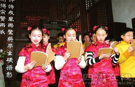昨日的草堂高朋滿座,著名學(xué)者、詩人鐘樹梁、流沙河、張志烈等文人雅士,杜甫草堂詩書畫院的藝術(shù)家及省內(nèi)文博單位代表悉數(shù)到場,近萬成都市民和外地游客也在祭拜活動(dòng)開始前涌入草堂。10時(shí)整,兩扇朱門開啟,一面印有“草堂人日”字樣的幡旗于門前緩緩升起,人們屏住呼吸,現(xiàn)場異常安靜。一陣稚嫩童聲傳來,眾人細(xì)聽,得悉孩童們念誦的正是憂國憂民憂天下的杜甫所作傳世詩歌:“安得廣廈千萬間,大庇天下寒士俱歡顏,風(fēng)雨不動(dòng)安如山!”、“國破山河在,城春草木深”、“兩個(gè)黃鸝鳴翠柳,一行白鷺上青天”……一邊應(yīng)和的是古琴大師們演奏的悠揚(yáng)古琴,詩圣杜甫心中的那份蒼涼詩情,瞬時(shí)穿越千年時(shí)光,直達(dá)眾人心中。一杯薄酒,一束臘梅,現(xiàn)場市民游客逐一上前向詩圣像鞠躬行禮,表達(dá)對(duì)杜甫的敬意。