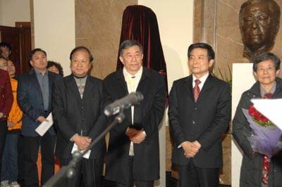 北京市委常委、宣傳部長、副市長蔡赴朝,老舍先生的子女舒乙先生、舒濟(jì)女士和舒雨女士,以及參加國際老舍研討會(huì)的一百八十余位專家學(xué)者,北京人藝全體院領(lǐng)導(dǎo)和各部門代表,當(dāng)年《龍須溝》首演陣容的演員代表鄭榕、李濱、舞美設(shè)計(jì)宋垠、韓西宇等,于是之先生的夫人李曼宜女士,新版《龍須溝》劇組代表顧威導(dǎo)演,老舍頭像作者、中央美術(shù)學(xué)院教授、雕塑藝術(shù)家孫家缽等出席了揭幕儀式。當(dāng)晚7時(shí)許,蔡赴朝和舒乙一起,共同為老舍先生雕塑揭幕。至此,中國近代文學(xué)史上的三位大師——老舍、焦菊隱、曹禺的銅像共同屹立、“聚首”在首都劇場大廳內(nèi),供后輩瞻仰!