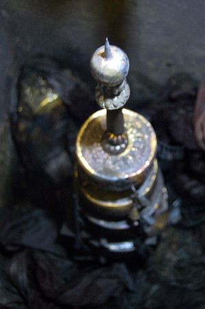 考古學(xué)家已經(jīng)論定,這座塔的制造地在揚(yáng)州,制造時間為宋真宗大中祥符四年。但是疑惑又來了,如此高規(guī)格的七寶阿育王塔究竟是民間奉養(yǎng)還是皇家供奉?據(jù)悉,宋真宗祥符年間,長干寺地下的佛祖舍利常常顯靈。為此,真宗敕命重新整修長干名寺,并在寺內(nèi)放置9層“圣感舍利塔”。就此論證,七寶阿育王塔具有皇家供奉的特點(diǎn),但是出土的實(shí)際情況卻大異其趣。因為從鐵函內(nèi)發(fā)現(xiàn)的文字看,供奉者卻是來自民間,供奉人的名字都是稀松平常的“三哥”、“四郎”、“大娘”等。而且,在塔基上還發(fā)現(xiàn)了“皇帝萬歲”等字,更說明這座七寶阿育王塔的民間屬性。