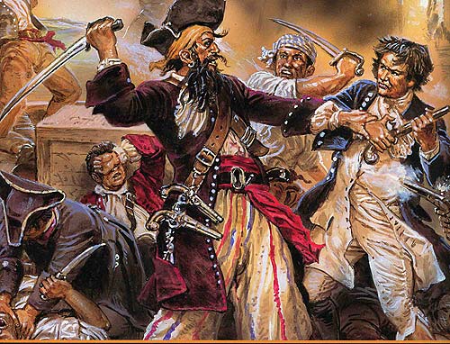 作為加勒比海盜的領軍人物之一,黑胡子見證了加勒比海盜的興起。黑胡子原名愛德華 蒂奇,1680年出生于英國,十幾歲時他便登上一條英國海盜船當了一個小海盜,這條海盜船擁有英國政府頒發(fā)的私掠許可證,因此可以在英國政府庇護下攻擊和掠奪敵對國家的商船。成年后,愛德華留起了一臉濃密的黑胡子,有時還會編成小辮,由此他獲得了黑胡子的綽號。據說,他力大如牛、酒量過人,可以在一整天海戰(zhàn)后,豪飲一夜朗姆酒,然后精神百倍地再次投入廝殺;因為嫌烈性的朗姆酒不夠勁,他還常常要在酒里灑上一把火藥。