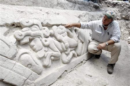 有塊石板顯示,兩個(gè)雙胞胎勇士被宇宙怪物包圍,而在他們上方有一個(gè)展開翅膀的鳥神。漢森是講述瑪雅文明的梅爾·吉布森2006年影片《啟示錄》的顧問,他說:“另一塊石板顯示,一個(gè)瑪雅谷神身上纏繞著一條波浪形大蛇!