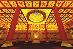 走進展覽大廳,正中間就是出土于南京大報恩寺遺址名揚四海的七寶鎏金阿育王塔的主展區(qū),設(shè)計師用“天圓地方”來形容他對核心之處的設(shè)計理念。崇圣殿的大廳內(nèi)從地面到屋頂估計有9米高,記者看見施工單位搭起了3層高的腳手架,幾名工人正在為圓頂上色,“圓頂共制作了三圈,最大的一圈直徑2.4米,一圈比一圈縮小,這樣可以體現(xiàn)出一種神秘的層次感。18幅飛天壁畫盤旋在圓頂周邊,最高一圈內(nèi)畫上藍色的夜空,然后安裝LD最新燈光系統(tǒng),16盞射燈對應(yīng)的地方是方形的仿漢白玉基座,座上四邊是進口的鋼制廊桿!庇浾咦铌P(guān)心的是基座上究竟陳列什么文物?無疑是大家都想要看到的,美麗無比的七寶鎏金阿育王塔。