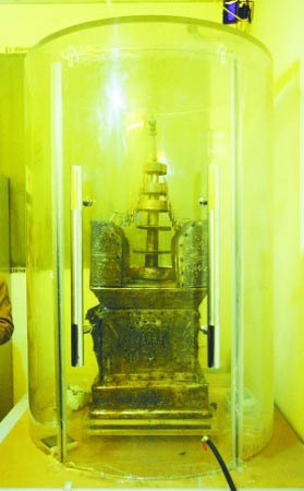 本月28日,“長(zhǎng)干寺地宮出土文物展”將在南京市博物館盛大開幕,被譽(yù)為“驚世大發(fā)現(xiàn)”的阿育王塔(如圖,崔曉攝)也將首次公開亮相。除了“塔王”,市民在這次展覽中或許還會(huì)收獲意外的驚喜。記者昨日獲悉,南京市博物館的考古專家近期可能會(huì)從阿育王塔中請(qǐng)出金棺銀槨。不出意外,這件裝有佛頂真骨、諸圣舍利、感應(yīng)舍利的“圣物”,也將和長(zhǎng)干寺地宮出土的其他文物一起出現(xiàn)在展覽現(xiàn)場(chǎng)。