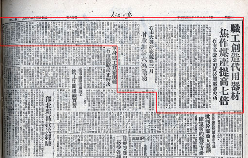 3. 1949年3月30日,《人民日報》關于焦作煤產(chǎn)提高七倍及石市紗廠增產(chǎn)細紗六萬余磅的報道