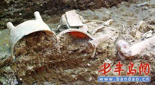 雖然這次沒有在墓葬中發(fā)現(xiàn)青銅鼎,但發(fā)現(xiàn)了簋、鬲、豆、罐等陶器,而且還發(fā)現(xiàn)了殉狗的骨骼及牛的部分骨骼。山東大學(xué)的王芬老師告訴記者,殉葬狗是當(dāng)時(shí)的一種社會(huì)風(fēng)俗。雖然當(dāng)時(shí)處于奴隸制社會(huì),但隨著文明的進(jìn)步,已經(jīng)用殉狗來代替殉人。此外,還發(fā)現(xiàn)了周代人用來存儲(chǔ)糧食的窖藏遺址和丟放垃圾的灰坑。根據(jù)此次的發(fā)掘結(jié)果,青島市文物保護(hù)考古研究所所長(zhǎng)林玉海認(rèn)為這是一個(gè)周代貴族的墓地。