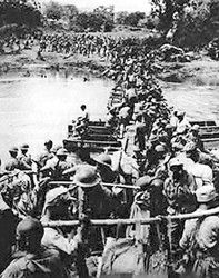 與此同時(shí),偵察分隊(duì)報(bào)告日軍師團(tuán)指揮部,盟軍工兵正在達(dá)羅以北山區(qū)日夜開辟公路,并沿途加固橋梁。1月28日晨,濃霧剛剛散去,從新背洋起飛的大機(jī)群就開始對日軍達(dá)羅陣地實(shí)施猛烈轟炸。由270輛坦克和90輛裝甲車組成的強(qiáng)大的機(jī)械化縱隊(duì)沿著達(dá)羅河谷快速推進(jìn),發(fā)動(dòng)機(jī)的咆哮好像經(jīng)久不息的雷聲在空曠的河谷中震蕩。很快,鋼鐵洪流的前鋒就好像一把尖刀插進(jìn)敵人陣地,撕裂敵人防線,然后掩護(hù)步兵反復(fù)砍殺,并不失時(shí)機(jī)向敵人縱深突進(jìn)。