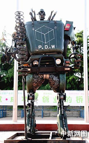 記者在現(xiàn)場看到,機器人兵團中最為奪目的就是高達5米1,重達1300公斤的“旋風(fēng)剛俠”,它威風(fēng)凜凜的坐鎮(zhèn)兵團的最后方,仿佛正在指揮戰(zhàn)役的將軍。最為值得一提的在于,這只機器人是由一輛報廢的北京汽車制造廠生產(chǎn)的金旋風(fēng)系列JEEP改裝而成的。