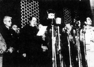 周恩來(lái)總理和中蘇友協(xié)會(huì)長(zhǎng)宋慶齡、副會(huì)長(zhǎng)劉少奇到前門車站歡迎。團(tuán)長(zhǎng)是蘇聯(lián)著名作家、蘇聯(lián)作協(xié)總書記法捷耶夫,代表團(tuán)中還有著名作家西蒙諾夫與好些有名的藝術(shù)家及高級(jí)干部,全團(tuán)約有40多人。當(dāng)時(shí),因?yàn)榭陀^環(huán)境和條件的限制,未能邀請(qǐng)外國(guó)的政府代表團(tuán)或政黨代表團(tuán)參加。這個(gè)蘇聯(lián)的民間代表團(tuán),與已經(jīng)在京的朝鮮人民代表團(tuán),加上一個(gè)來(lái)解放區(qū)訪問(wèn)的意大利共產(chǎn)黨中央委員斯巴諾,是有幸出席開國(guó)大典的僅有的外國(guó)人了。蘇聯(lián)的代表團(tuán)剛剛安頓下來(lái),下午就興奮地登上了天安門城樓。