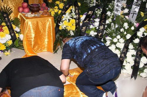 前晚剛結(jié)束人民大會堂演出的郭德綱和于謙,昨日趕到李文華的靈堂進(jìn)行吊唁,并在李文華的遺像前跪拜。
