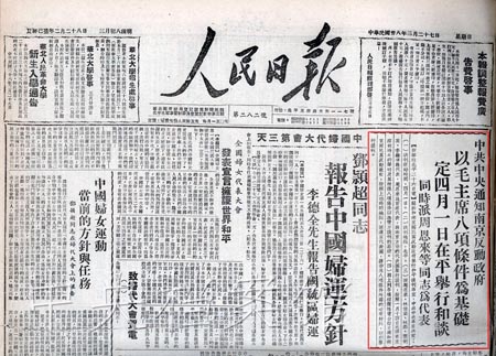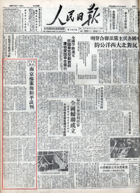 4月1日,由張治中、邵力子、黃紹竑、章士釗、李蒸、劉斐組成的南京國民黨政府談判代表團到達北平,周恩來等設宴招待。以周恩來為首席代表,林伯渠、林彪、葉劍英、李維漢、聶榮臻為成員的中共代表團,開始與國民黨代表團舉行和平談判。4月15日,形成八條二十四款的《國內(nèi)和平協(xié)定》。但結果,南京政府拒絕接受協(xié)定,徹底暴露了假和平的真面目。
