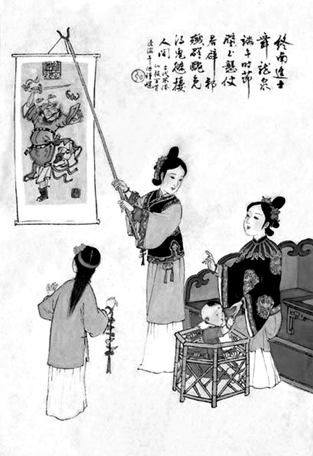 端午節(jié)期間,有些地方還流行居室中懸掛鐘馗像的習(xí)俗,據(jù)清代《北平風(fēng)俗類征》記載:“五月初一至初五為端陽節(jié),午時(shí)以朱墨畫鐘馗像,用雞血點(diǎn)眼,俗稱‘朱砂判’者懸屋中,謂能驅(qū)邪!鳖櫟撛谒摹肚寮武洝分幸灿杏浭觯骸斑m逢端午,堂中掛鐘馗畫圖一月,以祛邪魅!辩娯改颂瞥忻嫾覅堑雷庸P下的人物。據(jù)宋代《醉翁談錄》云:“除夜,舊傳唐明皇是夕夢鬼物,名曰鐘馗,既覺,命工繪畫之。至今人家圖其形,貼于門壁!毕鄠,唐明皇李隆基一次久病不愈,偶有一夜,夢見一大鬼捉去一小鬼,大鬼聲稱自己名鐘馗,試武舉未中,誓為皇帝陛下除天下妖孽。唐明皇夢醒,即刻病好。于是,便命吳道子將夢中的鐘馗捉鬼作成一幅畫,掛于宮中以避邪和鎮(zhèn)妖。