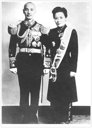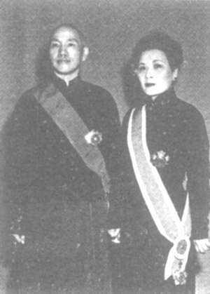 1927年12月1日,蔣介石和宋美齡舉行婚禮;槎Y分兩次進(jìn)行:先在宋宅會(huì)客廳中舉行西式婚禮,后在戈登路大華飯店出席中式婚禮。大華飯店的婚禮在樂曲聲中宣告完成后,蔣介石和宋美齡來到花園攝影。在一系列由中華照相館的師傅拍攝的結(jié)婚照片上,蔣介石穿尖領(lǐng)襯衫、打淺色領(lǐng)帶,配著深色西服,胸口還別著花,宋美齡則身穿淺色旗袍,斜披白紗,頭戴一個(gè)用花蕾編成的小花冠,手捧一束玫瑰。