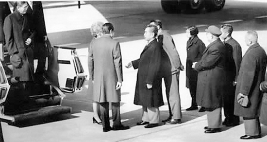 專機(jī)于上午11時(shí)30分抵達(dá)北京東郊首都機(jī)場。尼克松總統(tǒng)與其夫人并排手挽手頂著寒風(fēng),穩(wěn)步踏上專機(jī)舷梯。然后尼克松總統(tǒng)搶先一步走下舷梯,主動(dòng)伸出右手,周總理小步上前,也伸出手來,兩只手熱烈有力地緊握在一起。美國國務(wù)卿杜勒斯在1954年日內(nèi)瓦會(huì)議期間拒絕與中國總理周恩來握手的時(shí)代,終于過去了。