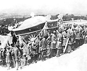 第一路段是從北平西山的碧云寺至前門的火車站,采用人力。這一路段原本計劃使用汽車,但需要事先對碧云寺至西直門長達48華里的馬路進行徹底大修,時間緊迫,難以實施,最后還是“決用杠夫奉移”。迎櫬專員辦事處最終選定專營“紅白喜事”的西長安街日升杠房,雇用杠夫共分3班,每班除64名杠夫外,還有撥旗夫、拉幌夫、以及負責遺像亭的夫役等等,總人數(shù)為283名,一律著藍白兩色的統(tǒng)一服裝。在整個移靈“奉安”過程以及南下途中每一次更換交通工具、直至最后將孫中山的棺槨安放入墓,均由他們負責。