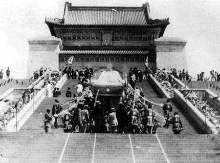 上午8時(shí),各行列先后到達(dá)紫金山麓,由糾察員引導(dǎo)至指定地點(diǎn)肅立恭候。奉安籌備人員也將靈輿安置于石級(jí)前廣場(chǎng)上守候。靈輿為亭子式,用藍(lán)綢裹扎,四周懸白綢彩球。杠夫108人分別肅立在靈輿兩側(cè)等候。9時(shí)05分,巨幅遺像到達(dá)廣場(chǎng),遺像前有“肅立”、“致敬”旗兩面,全體參加人員即脫帽肅立致敬。不久,各國(guó)專使、外賓也列隊(duì)到達(dá),登上第一層石級(jí)平臺(tái)恭候。9時(shí)20分靈車緩緩開到廣場(chǎng),停在靈輿前。家屬下車,進(jìn)黑色布幔中肅立于靈櫬之側(cè)。國(guó)民黨中央委員、國(guó)民政府委員等送櫬人員由總指揮朱培德、總干事孔祥熙指揮,各按規(guī)定地點(diǎn)肅立。9時(shí)30分,由孔祥熙、吳鐵城、鄭洪年等率領(lǐng)杠夫10人將靈櫬從靈車上降下,移上弼輿。9時(shí)45分起杠,踏石級(jí)而上,40名樂手奏哀樂前導(dǎo),宋慶齡率領(lǐng)眾親屬等女眷在布幔內(nèi)步行送殯,執(zhí)紼人員在兩側(cè)恭扶前進(jìn)。10時(shí)08分,靈輿抵達(dá)祭堂前平臺(tái),杠夫換用小杠抬靈櫬,宣贊員宣贊,執(zhí)紼人員恭扶靈櫬入靈堂,停于祭堂中央,肅靜片刻后,由宣贊員宣贊,舉行奉安典禮。奏哀樂后,全體行三鞠躬禮,然后獻(xiàn)花圈,讀誄文,蔣介石主祭,譚延闿、胡漢民、王寵惠、戴季陶、蔡元培陪祭。典禮完畢后,孔祥熙率領(lǐng)杠夫?qū)㈧`櫬移入墓室,孫中山親屬、國(guó)民黨中央代表蔣介石、故舊代表犬養(yǎng)毅、各國(guó)專使代表歐登科(荷蘭專使)隨同進(jìn)入墓室,率領(lǐng)杠夫?qū)O中山靈櫬奉安于壙?jī)?nèi),靈穴上置捷克雕塑家高琪所刻孫中山先生漢白玉臥像。這時(shí),獅子山炮臺(tái)響起一百零一響禮炮,全國(guó)民眾停止工作,默哀3分鐘,12時(shí)正,奉安完畢。在祭堂內(nèi)參加大典的人員依次進(jìn)墓門瞻仰。然后回到祭堂,全體集合,再行鞠躬禮,奏哀樂。最后,由夫人宋慶齡率領(lǐng)孫科夫婦、戴恩賽(孫中山女婿)夫婦等將墓門關(guān)閉,備極隆重的奉安大典告成。當(dāng)日,于陵下矗立一塊巨牌,上刻譚延闿所書“民國(guó)十八年六月一日,中國(guó)國(guó)民黨葬總理孫先生于此”。