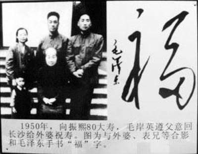 1950年,向振熙80大壽,毛岸英遵父意回長(zhǎng)沙給外婆祝壽。圖為其與外婆、表兄等合影和毛澤東手書(shū)“!弊帧