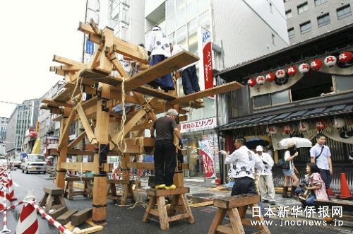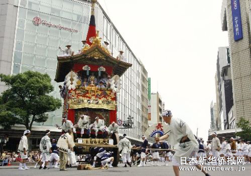 中新網(wǎng)7月19日電 據(jù)日本新華僑報報道,時值梅雨季節(jié),日本古城京都又迎來了一年一度的祗園祭的高潮。7月17日上午9時許,32輛用彩色織品裝飾的燦爛花轎彩車冒著牛毛細(xì)雨,沿著用竹片鋪就的街道,在京都市中心“花轎巡行”。 過程中最精彩的場面要數(shù)在四條河原町的“街口轉(zhuǎn)向”,10多噸重的彩車在十字路口來了個90度的轉(zhuǎn)身。當(dāng)?shù)鼐用裨谲囕喯落仢M竹片并灑上水,彩車在“嘎吱嘎吱”的巨響中來回旋轉(zhuǎn),博得了現(xiàn)場人群的熱烈喝彩與掌聲。