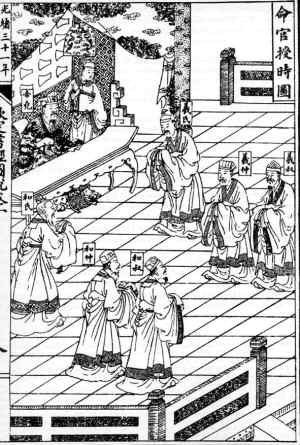 制定歷法,就是“觀象授時”,對統(tǒng)治者來說是最重要的事情。天文歷法象征著帝王“君權(quán)神授”的統(tǒng)治權(quán)威。傳說堯帝就命天文學(xué)家羲、和二氏進(jìn)行天文觀測以制定歷法。《尚書·堯典》說:“乃命羲和,欽若昊天,歷象日月星辰!碑(dāng)時是以觀測日出方位和黃昏時中天的恒星來確定季節(jié)。根據(jù)書中記錄的“中星”天象,可以推斷堯帝“觀象授時”的年代約在公元前23世紀(jì)。當(dāng)時制定的歷法是一年有366天,以置閏月的方法保持與季節(jié)同步。