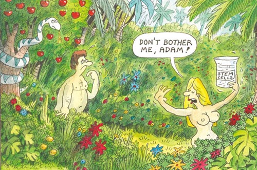 7月9 日,英國(guó)《太陽報(bào)》登出一張漫畫,在漫畫中,置身于伊甸園中的夏娃手持一只貼著“干細(xì)胞”標(biāo)簽的燒杯,一臉傲慢地說:“亞當(dāng),請(qǐng)別煩我!”對(duì)事件的中心人物納伊尼亞教授而言,倫理上的質(zhì)疑和爭(zhēng)議似乎并沒有給他帶來什么困擾。他認(rèn)為此項(xiàng)研究可以為那些想要孩子卻沒有能力的家庭帶去福音,而爭(zhēng)議則“完全可以通過法律最后進(jìn)行規(guī)約”。面對(duì)紛至沓來的媒體,納伊尼亞教授仍沉浸在實(shí)驗(yàn)成功所帶來的興奮之中:“這太令人興奮了!這些人造的精子有頭,有尾巴,也可以移動(dòng),它們具備能夠產(chǎn)生生命的一切特質(zhì)!”