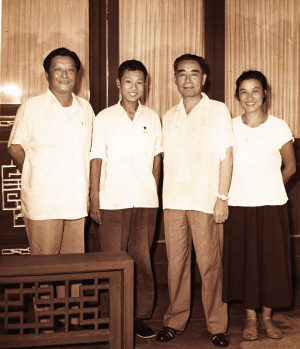 1961年7月初,我們在北京工作的堂兄爾輝結(jié)婚,因?yàn)樗婺负湍赣H都在淮安老家,伯伯和七媽為他們在西花廳舉辦了婚禮,飯前參加婚禮的三十多人一起照了相,我去晚了沒趕上。飯后,七媽拉住我說:“你來晚了,沒趕上照相,又要參軍走了,來和伯伯照個(gè)相吧。”維世姐姐說:“金山也來晚了,一起照吧!庇谑怯辛松厦娴倪@張照片。