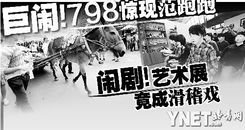 太多的意外使首屆798雙年展更像是一臺(tái)鬧劇,可諷刺的是,這些“節(jié)目”使雙年展比一般藝術(shù)雙年展、三年展賺得了更多的眼球。而在雙年展主展場(chǎng)內(nèi),記者發(fā)現(xiàn)一改眾多展覽的模樣,架上繪畫(huà)已經(jīng)成為展場(chǎng)中的稀有品種,包括搭臺(tái)唱戲、流動(dòng)藥房、村委會(huì)議,各種裝置作品以出人意料的方式“藝術(shù)”著,從范跑跑開(kāi)始,那些不甘寂寞的參展藝術(shù)家似乎都深諳眼球效應(yīng)的道理,可觀眾的質(zhì)疑是:難道作秀已比藝術(shù)更重要?