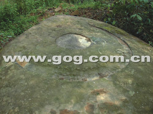 最為明顯的是巨石表面用鐵器鑿成的圓形圖案,該圖案是由一個(gè)直徑約1.5米未連接的半圓,圍住一個(gè)直徑約0.6米的小圓,半圓的線條是被鑿凹進(jìn)去的,每隔約3厘米便有一根豎線,而被圍在中間的圓心也是陰刻的,上面縱橫著鑿刻的線條,在圓心兩側(cè),還有兩個(gè)星形的小圓圈。