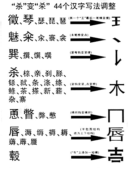 一些網(wǎng)友認(rèn)為,調(diào)整漢字如果只注重美感,就把傳統(tǒng)的東西丟掉了。比如“殺”字,本身下面像鉤像矛,有“殺氣”,下面改成“木”后,感覺(jué)就變了。專(zhuān)家解釋,這次調(diào)整字形有些地方參考了臺(tái)灣的字形。