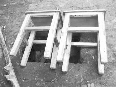 該“地洞”位于景區(qū)碑座南約20米處,神道的東側。洞口長約40厘米,寬約20厘米,目前,四周已被一條鐵鏈圈住,一個“小心地滑”的警示牌放在一旁,兩把椅子橫在洞口。透過縫隙向下看,該洞呈圓形,洞底距離地面約有50厘米,里面有一些雜物,洞口周圍的青磚,也出現(xiàn)了松動跡象。