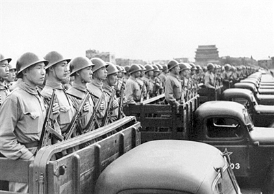 陸、海、空三軍佩戴統(tǒng)一制式的帽徽和胸章,著50式軍服受閱,整齊劃一,面貌一新。新中國(guó)成立后我軍第一次有了統(tǒng)一制式、統(tǒng)一標(biāo)準(zhǔn)的軍服。