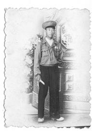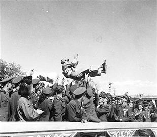閱兵結(jié)束后,張百川跟同學們紛紛跑到照相館拍照留念。大家都穿著閱兵時的裝束:為閱兵專門配發(fā)的綠色飛行員帽子、上衣,白色襯衣,腳上穿著咖啡色的仿毛皮鞋。張百川介紹說,原本發(fā)的是普通的軍用膠鞋,為了踢正步時鏗鏘有力,特意發(fā)放了這樣的皮鞋,據(jù)說是抗日時繳獲日軍的。