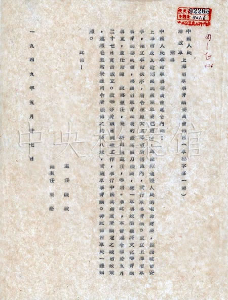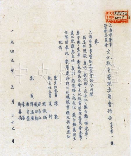 上海解放后,上海市軍管會(huì)成立,下設(shè)軍事、政務(wù)、財(cái)政、文化教育四個(gè)方面的接管委員會(huì)。1949年5月29日,上海軍管會(huì)文化教育管理委員會(huì)派軍代表接管大中華唱片廠。6月2日,大中華唱片廠恢復(fù)生產(chǎn),灌制了解放區(qū)歌曲《解放區(qū)的天》、《軍隊(duì)向前進(jìn)》、《唱?jiǎng)倮、《蔣家兵呀一團(tuán)糟》、《向人民解放軍致敬》、《扭向新中國(guó)》、《快樂(lè)的農(nóng)村》等七種,準(zhǔn)備由各廣播電臺(tái)播送。8月,以“人民唱片”為牌號(hào)出版唱片。到年底,共出版60個(gè)牌號(hào),約1萬(wàn)張粗紋唱片,其中有歌曲《東方紅》、《國(guó)際歌》、《咱們工人有力量》、《贊美新中國(guó)》以及歌劇、民樂(lè)、京劇、越劇、川劇、滬劇、山東快書等。