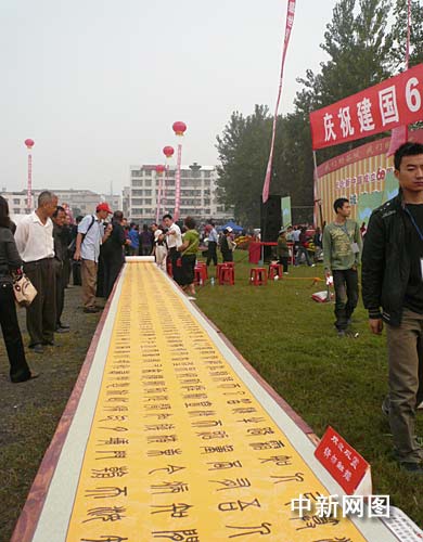 中新社襄樊9月29日電 (涂玉國)長一百一十米、寬零點八米,用五種字體書寫的毛主席詩詞的書法長卷,二十九日在湖北省襄樊市谷城縣博覽會上現(xiàn)身。這是該縣文化館副館長、書法美術(shù)家協(xié)會主席許祥強為慶祝新中國成立六十周年而作。