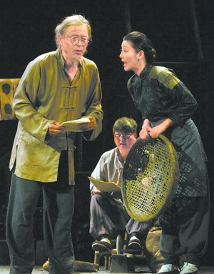 畢竟作者是初次染指舞臺(tái)劇,臺(tái)詞俏皮生動(dòng),人物個(gè)性鮮明,大段大段的“獨(dú)白”卻像是在寫小說。小說往往容許單管獨(dú)奏,或花開數(shù)朵各表一枝,戲劇除獨(dú)角戲外,必定是十指彈琴,彼此呼應(yīng)。幸虧何冰是一位壓得住臺(tái)的優(yōu)秀演員,那熱力四射的情感深度與舞臺(tái)張力,將大段大段的臺(tái)詞化成旁若無人的心靈傾訴,挽救了眾人臺(tái)詞空白的尷尬。也幸虧導(dǎo)演林兆華故意犯禁的巧妙處理,以群體角色靜默不動(dòng)或極少動(dòng)作,反襯苑大頭的情感井噴;以表現(xiàn)性的非現(xiàn)實(shí)場(chǎng)面,處理這一反常的劇作和生活情態(tài),出乎意表地使第三幕后段反而成為全劇最具特色的舞臺(tái)處理,從而使寫實(shí)與非寫實(shí)的界限變得模糊,或者說開拓了寫實(shí)主義戲劇更為寬闊的表現(xiàn)空間。 (林克歡)