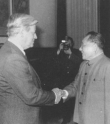 施密特:或許是他不達目的不止的意志力和他的說服力。不過,見過毛之后與鄧小平進行的第一次長談,對我來說更多是令人失望的。我和毛澤東談的時候,鄧小平是在場的,他只是聽,沒有一絲一毫的表情流露出他對毛的看法是怎么想的。