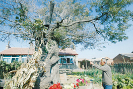 記者轉(zhuǎn)頭望去,金色的陽光灑滿綠色的庭院,庭院中央,一棵四人合抱的大槐樹矗立著,盡管近一半的樹干被燒毀,但另一半仍然枝繁葉茂,給庭院提供一片滋潤(rùn)的樹陰。那位村民說,這棵神樹遭雷劈過,不過,神樹數(shù)次逢兇化吉。