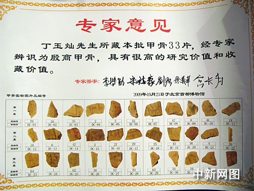 在本次論壇上,廈門(mén)當(dāng)代置業(yè)集團(tuán)副總裁、廈門(mén)復(fù)文美術(shù)館副館長(zhǎng)、福建海泉蘭花實(shí)業(yè)有限公司董事長(zhǎng)丁玉燦,將個(gè)人繼承、收藏的,經(jīng)現(xiàn)場(chǎng)專(zhuān)家組“辨識(shí)為殷商甲骨,具有很高的研究?jī)r(jià)值和收藏價(jià)值”的三十三片甲骨,無(wú)償?shù)鼐栀?zèng)給南靖縣人民政府永久收藏。