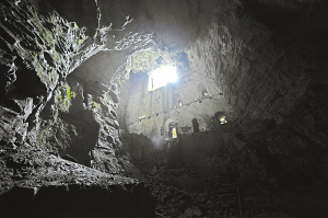 最吸引劉冬故地重游的是,洞內(nèi)除那個(gè)200多平方米的空間讓人無(wú)限暇想外,旁邊石壁開(kāi)鑿、用于支撐木板建樓的石孔讓人嘆為觀止:石孔有30多個(gè),從洞壁這端呼應(yīng)另一端,跨度超過(guò)30米。如此遠(yuǎn)的距離,古時(shí)建樓常用的材料——木棒,是如何解決受力和加固等建筑難題的?劉想不明白,更無(wú)法得知當(dāng)時(shí)洞內(nèi)小樓模樣。