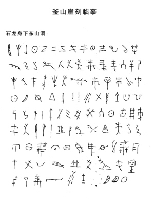 此外,釜山的崖洞內(nèi)還留有109個(gè)“古文字”。經(jīng)專家推測(cè),這些“古文字”均為上古黃帝時(shí)代人類留下的符號(hào),但其用意和內(nèi)容目前仍然無(wú)法破譯?脊湃藛T在研究對(duì)比中發(fā)現(xiàn),釜山崖刻和史前出土的刻畫(huà)符號(hào)有相同的,與早期青銅器上的刻畫(huà)符號(hào)也有相同的。這說(shuō)明釜山的摩崖石刻不僅繼承了仰韶時(shí)期的特點(diǎn),同時(shí)又發(fā)展到了青銅器時(shí)代。這些刻畫(huà)符號(hào)的上限是公元前5000多年,下限是先商時(shí)期,大致相當(dāng)于黃帝“合符”的年代。