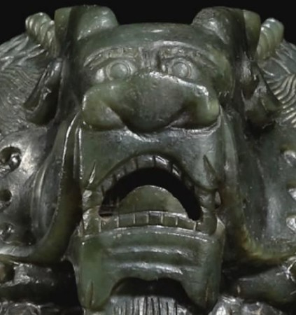 李教授同時(shí)指出此次拍賣的“八徵耄念之寶”印龍爪、頭部紋飾雕工疲弱而少章法、刀法。龍的發(fā)紋不上沖,火焰紋并不上揚(yáng),龍爪粗野乏力、沒有抓力,缺乏動(dòng)感,似走獸類臥伏在地面一般,龍脊拱沿處造型用,用刀不干凈表現(xiàn)無弧勢(shì),顯出臃腫、毫無生氣,因造型力度沒把握好,鼻部中軸整塊竟不居眼、口正中,電腦圖片放大后看到門牙和邊牙竟上下鋸裂,此應(yīng)為機(jī)雕出了差錯(cuò)留下的殘缺,龍的形狀與面部表情呈驚恐狀,毫無龍威,粗糙得象磚雕,更無皇家氣象(圖五)。而拍賣玉璽竟煞有介事地配了個(gè)底坐“以舊充好”,以示此玉璽大有來歷,作偽者殊不知清宮玉璽多封黃綬帶(配綬帶寓意長壽,也是使用方便),并承之以紫檀木匣。大部分寶匣并加以雕工或描金,以彰顯出玉璽的尊貴與皇家氣象。