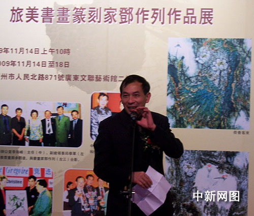 中新網(wǎng)廣州11月14日電(記者 莫非 通訊員 葉藍(lán))旅居美國西雅圖著名書畫篆刻家鄧作列書畫藝術(shù)作品展,于2009年11月14日至18日在廣東文聯(lián)藝術(shù)館舉行,當(dāng)?shù)貎S界與藝術(shù)界負(fù)責(zé)人和書畫藝術(shù)家、各界友好人士逾百人參加開幕典禮。