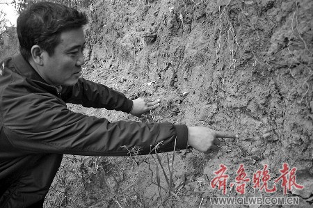 11月21日,跟著宮德杰,記者來到臨朐縣東上林村,從1米到3米不等高的河邊臺地斷崖中,記者看到了不少北辛文化遺址。宮德杰說,遺址大多位于東上林村東南的河邊臺地上。遺址西南部斷崖處暴露有文化層、灰坑、墓葬、壕溝、紅燒土等遺跡遺物。由斷崖觀察,北辛文化層厚約0.5至2米不等。