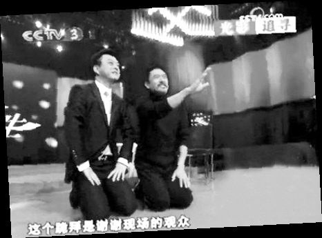 周潤(rùn)發(fā)(突然拉著朱軍,面對(duì)現(xiàn)場(chǎng)觀眾跪了下來(lái)):讓你感受一下《孔子》是如何復(fù)原兩千年前的真實(shí)生活的。(接著以額貼地,實(shí)實(shí)在在地給觀眾叩了一個(gè)頭)這個(gè)跪拜是謝謝現(xiàn)場(chǎng)的觀眾。