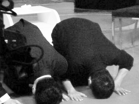 據(jù)網(wǎng)友爆料,節(jié)目錄制一開(kāi)始朱軍先采訪了導(dǎo)演胡玫和主演周迅等主創(chuàng),大家也都相當(dāng)配合《藝術(shù)人生》一貫的煽情風(fēng)格。最后發(fā)哥出場(chǎng),現(xiàn)場(chǎng)氣氛立即來(lái)了個(gè) 180度大逆轉(zhuǎn)。周潤(rùn)發(fā)先是慢條斯理地說(shuō)了一句“《孔子》應(yīng)該搞一點(diǎn)氣氛”之后,讓工作人員把燈關(guān)掉。隨后,發(fā)哥突然拉著朱軍,面對(duì)現(xiàn)場(chǎng)觀眾跪了下來(lái),說(shuō)這是為了讓他感受《孔子》是如何復(fù)原兩千年前的真實(shí)生活,之后以額貼地,給觀眾叩頭,說(shuō)要感謝觀眾。緊接著,發(fā)哥又給朱軍叩頭,學(xué)著朱軍慣用的深情語(yǔ)調(diào),朱軍跟他父親的故事令他非常感動(dòng)。這下,朱軍不得不以磕頭“還禮”。而在12月2日播出的節(jié)目中,只保留了周潤(rùn)發(fā)給朱軍磕頭的一幕,朱軍后來(lái)的“還禮”卻被剪掉了。