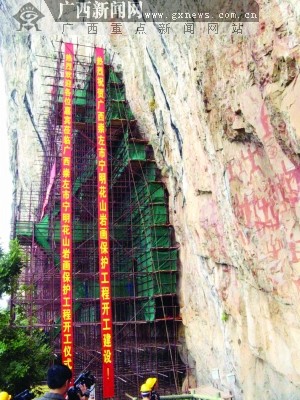 昨日上午,在簡短而隆重的開工儀式后,廣西崇左市寧明花山巖畫保護(hù)工程正式開工;ㄉ綆r畫保護(hù)前期工作長達(dá)18年,僅在方案研究、材料試驗和方案設(shè)計等工作上就耗時5年,其所動用的學(xué)科領(lǐng)域和專家之廣、所耗資金之多,不僅在廣西文物保護(hù)史上史無前例,就是在中國文物保護(hù)史上也極為罕見,而此次開工的第一期搶救性加固工程被專家稱為“要干救命的活”。那么等著“救命”的花山巖畫其病害危重到什么程度?為什么前期工作要花費那么長時間?一期保護(hù)工程將使用哪些先進(jìn)技術(shù)?我們以后還能不能看到它的原貌?記者在保護(hù)工程現(xiàn)場進(jìn)行了采訪。
